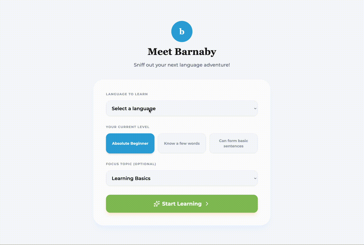 A working app supporting 14 languages (Arabic to Turkish), where users can practice vocabulary, quiz themselves, and have Barnaby fetch new words on demand!