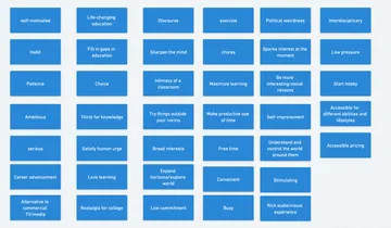 This meant spending two weeks studying every graph and reading hundreds of survey responses. We then looked for patterns in the ways that people described learning, drawing out key words and key phrases. We coded giant Airtables full of data, until at the end, we were able to draw out a list of the most common words and expressions people used to describe why they loved learning.