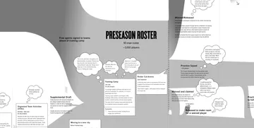 The journey map reads from left to right on a timeline. The middle section (representing the yearly rhythm of Preseason, Regular Season, Postseason, and Offseason) is meant to be read as a “loop” for each year of a player’s career.
