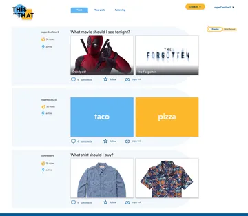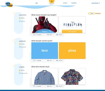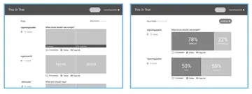 Julia took the wireframes and began refining This or That’s visual design. Page elements became lighter and smaller, leaving space for user-generated content to shine. Geometric accents and icons were added to convey positioning within the site, expiration statuses and more.