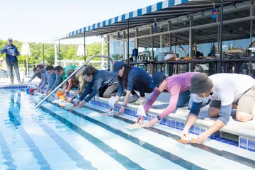 But, it’s also great when laughter bursts out serendipitously, from general levity. It’s a bit silly to have grown adults gathered around a pool deck putting together a toy boat and cleverly (?) decorating it.