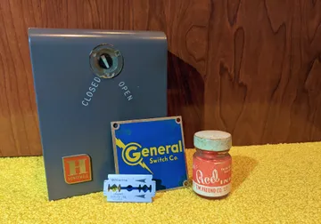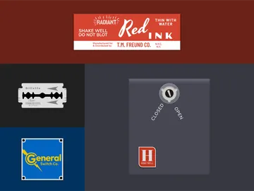 Over the past eight years, we've been renovating and modernizing the entire house while attempting to keep true to its original vibe. In doing this work, I stumbled into a bit of accidental archaeology. Behind walls, under vanities, and in other places, I've come across small, lost artifacts from decades ago. My favorites amongst these discoveries are an electric box, a dried-up bottle of ink, a logo plate for a switch company, and a disposable razor. In particular, I love the fonts used in the designs of these items.