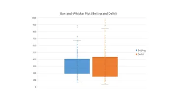 - The median of Delhi’s and Beijing’s weekly max values are quite close: 302 and 271, respectively. Delhi’s standard deviation, however, is far larger than Beijing’s: 212.2 and 153.1, respectively. Delhi’s wider distribution of AQI values is evident through the box-and-whisker plot below.