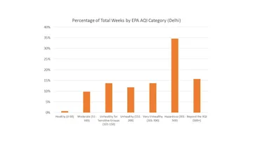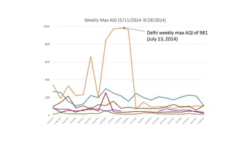 - The highest reading recorded was 981 during the week of July 13, 2014 in Delhi. The average daily high temperature during July in Delhi is 35°C (95 degrees Fahrenheit). Yikes. (Below)