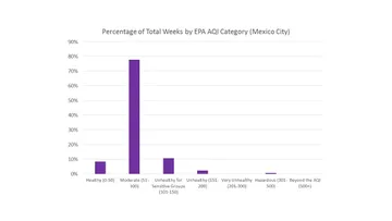 Below are histograms of the cities’ weekly max levels from January 2013 to April 2016 in terms of the seven EPA AQI categories.