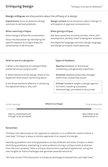 Discussing Design by Adam Connor and Aaron Irizzari. Design critique is hard. Most of us stumble through them, picking up bumps and bruises along the way. But they don’t have to be painful. Connor and Irizzari give pertinent advice about how to lead productive critiques with teams and clients that move designs forward, avoiding the pitfalls along the way.