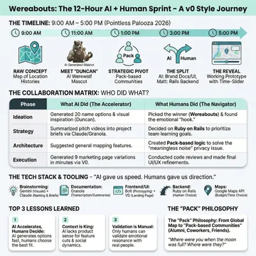 This was Matt's and my first Palooza. Maria had participated before, but this was the first year where AI played such a big role. This is the story of building Wereabouts. The decisions we made, the problems we hit, and what we learned about the balance between AI assistance and human judgment.