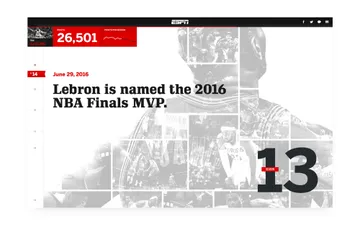 We worked with ESPN to design and build an engaging, interactive timeline that guides users through LeBron's historic rise through the NBA. This story is told through stats, compelling photography, and a unique page design that shows how far LeBron has come — and what it will take to become the best player of all time.