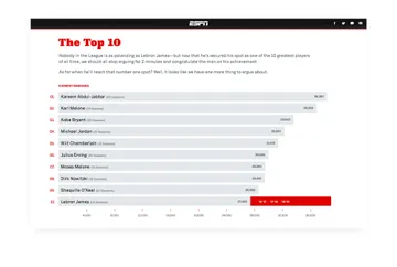 Create a unique editorial experience that highlights the significance of LeBron’s entry into the NBA’s Top-10 highest scorers.