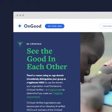 Going legit. For NGOs and nonprofits, establishing legitimacy in the digital space can often be a challenge, especially as unscrupulous groups can now easily spin up dummy sites and begin soliciting support. As the organization already responsible for the .org domain, the Public Interest Registry (PIR) realized the solution to this problem might lay in the new .ngo domain they had recently begun managing. By offering .ngo only to groups who can verify their nonprofit status, PIR has provided a way to instantly affirm group authenticity through an exclusive domain, and created an online community of .ngo peer organizations. Our task was to help PIR develop the .ngo-specific sub-brand called “OnGood” and then use that brand to guide a full redesign of their marketing site.
